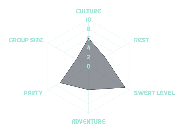 Group Size – How many people you’ll be sharing the experience with (1 = 6 guests, 10 = 60+) | Party – The level of nightlife, dancing, and evening energy. | Culture – How immersed you’ll be in local traditions, food, and community. | Rest – The amount of downtime, relaxation, and quiet moments built in. | Sweat Level – How intense and frequent the workouts will be. | Adventure – The dose of excursions, exploration, and off-the-beaten-path moments.